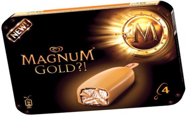 Nouveau parfum pour la célèbre glace de Miko (groupe Unilever). Le nouveau Magnum Gold propose sous une enveloppe craquante de chocolat au lait dorée une glace vanille avec son marbrage sauce caramel et sa pointe de sel pour relever cette nouvelle recette que Magnum annonce comme étant "des plus subtiles".