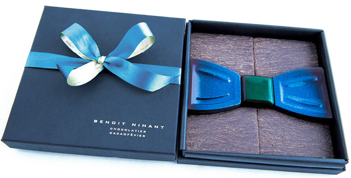 Cette année, le cacao févier Benoît Nihant propose un nœud papillon en chocolat praliné que les papas gourmands se feront un plaisir de croquer. Reposant fièrement sur son socle de Chocolat Grand Cru, cet accessoire indémodable est réalisé en praliné Maison aux noisettes du Piémont et aux amandes de Provence. Il fait passer un message d’amour et de tendresse, à l’occasion de leurs fêtes !