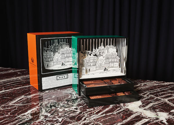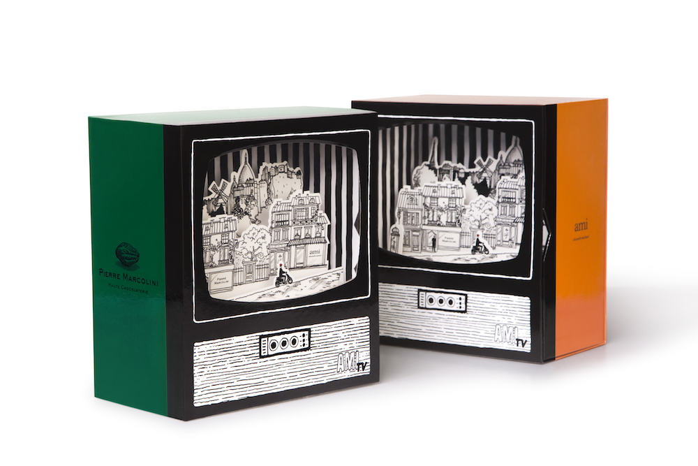 Connu autant pour son éternel bonnet rouge que pour son coup de crayon à la fois élégant et déstructuré unissant le chic au street style, Alexandre Mattiussi, fondateur de la griffe AMI, donne le ton pour la nouvelle création de la Maison Marcolini. Le styliste plante ainsi le décor de la nouvelle Barre2 Chocolat Marcolini dans une télévision vintage, promenant son crayon sur les ruelles et les kiosques de la Butte de Montmartre Paris, sur un fond de rayures noir et blanc en contre-plis. Un clin d’œil à la magie enfantine des livres pop-up et au Paris des années 50, où il se représente sur son scooter passant devant Pierre Marcolini et sa boutique...