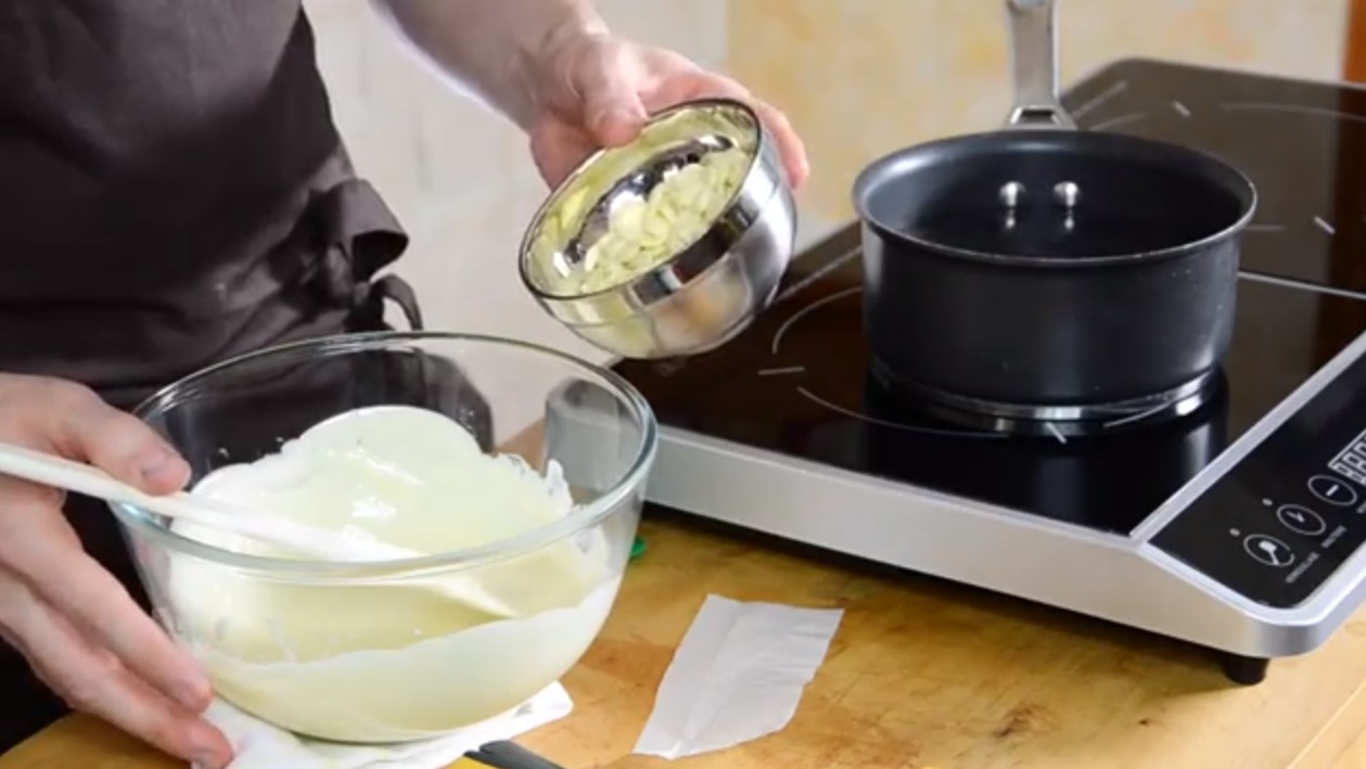 Alors là, nous allons voir la mise en température du chocolat, donc du chocolat blanc pour cet exemple-là, au d'un mari. Alors tout simplement donc, une plaque : soit plaques à induction bien sûr, soit plaque à gaz, etc. Une casserole avec de l'eau. Alors soit la moitié aux trois quarts, mais en tout cas, un bol qui va vraiment être au contact de l'eau. Avec toujours son chiffon à côté pour que l'eau ne se diffuse pas partout sur votre plan de travail. Vous voyez là, c’est en contact de l'eau, ce qui permettra une meilleure fonte du chocolat. On va mettre donc la machine en route.