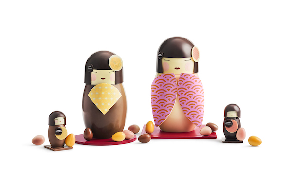 La collection de Pâques de Pierre Marcolini se décline en tons rose et jaune pastel mais surtout en japonais ! Les œufs se sont transformés en poupées traditionnelles japonaise. Avec un éventail ou en kimono, tout est à croquer chez ces adorables figurines. Corps au chocolat noir, au lait ou blanc, il n’y a qu’à choisir la taille et son accompagnement.