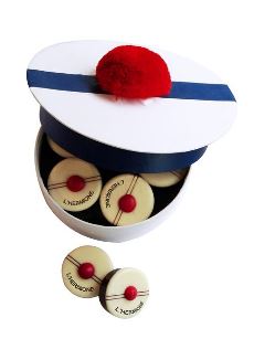 L’artisan chocolatier Pierre Le Pétitcorps (Brest et Perros-Guirec) a tenu a donner une touche gourmande au 14 juillet grâce au Pompon, une spécialité bretonne. Ainsi les amoureux de chocolat pourront déguster ces petits chocolats noirs faits à base d’ingrédients délicatement sélectionnés. Comme garniture, l’artisan chocolatier a opté pour le caramel au beurre salé et pour ce qui est du design, il a préféré un look reflétant le bord de la mer. Le Pompon la forme du «bachi» est le plus marin des matelots de la Marine Nationale. De plus, le coffret a la forme du béret de Marine ornée de la véritable houppette rouge de la Marine Nationale de France. La houppette est un produit singulier fabriquée par une entreprise de La Chartre-sur-le-Loir (Sarthe).