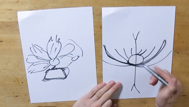 Pour cela, je vais avoir besoin de trois supports, de trois boules au chocolat. Je vais principalement le faire blanc et on va voir comment faire aussi les différents pétales. Je vais faire des grandes, des petites, des moyennes. Si on coupait de cette vue-là, de côté, là c’est le dessus et là, le dessous. Donc là, quand on colle les pétales, on les colle ici pour que ce soit en dessous. On met les plus grandes en dessous en ensuite, vous les coller ici les moins grandes. Je dessine, mais on verra après en réel. Vous pouvez même mettre des plus grandes. C’est une vue de coupe, ce qui permet au-dessus d’avoir une belle étendue au niveau de la fleur.