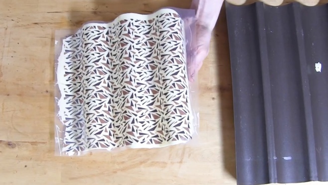Dans cette vidéo, je vais vous montrer la décoration dent de loup, souvent appelé sur cette typologie. J’ai fait tout simplement couler du chocolat blanc sur un chocolat transfert, avec des petites pépites et là, je l’ai mis tout du long pour qu’il prenne la forme de la plaque une fois sec.