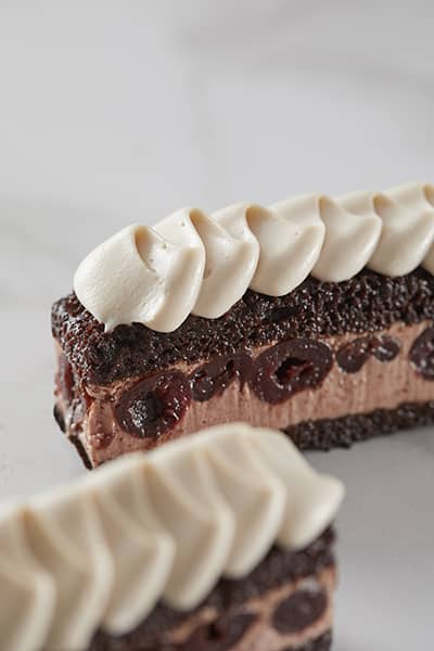 Imbiber le gâteau avec le sirop de cerises. Ajouter la mousse aux cerises et parsemer de cerises. Ajouter une deuxième couche de gâteau et faire tremper. Congeler. Découpez en morceaux individuels. Monter la ganache et la mettre sur les tranches.