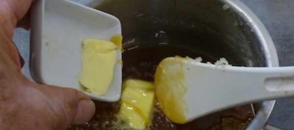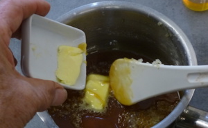 Préparation: 20 min Budget: 2 ♦ Caramel cacao 50 g d’eau 250 g de glucose 250 g de sucre 300 g de lait 370 g de crème 37% de matière grasse 75 g de cacao pur pâte 50 g de beurre de cacao 40 g de beurre 100 g de raisins secs 50 g d’amandes effilées - Cuire à 145°C l’eau, le glucose et le sucre. - Décuire progressivement avec...
