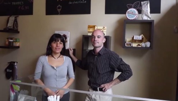 Émilie – Bonjour. Je vais vous demander de vous présenter, s’il vous plaît. Angelica – Moi je m’appelle Angelica Perez. Je suis péruvienne. Mon mari lui il est belge. Mark – En fait on s’est rencontré en Belgique. J’ai étudié la chocolaterie, donc je suis chocolatier. J’ai étudié ça pendant quatre ans et le but c’était de...