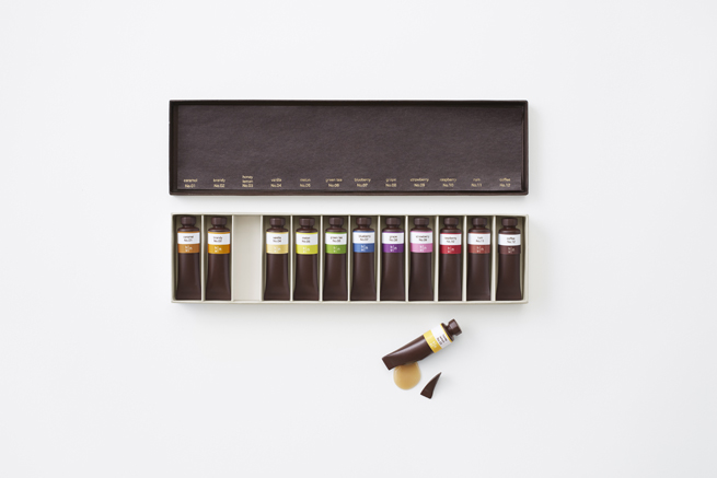 Le design de ce coffret est simple et alléchant. Seule la lapidaire mais tentante mention "Chocolat" est inscrite sur le boîtier. Ce design épuré propre à nendo cache en réalité 12 tubes de peinture chocolat. Chaque tube est associé à une couleur et propose une expérience inédite. On pourra découvrir un sirop aromatisé accompagnant du chocolat gourmand pour chaque tube après ouverture.