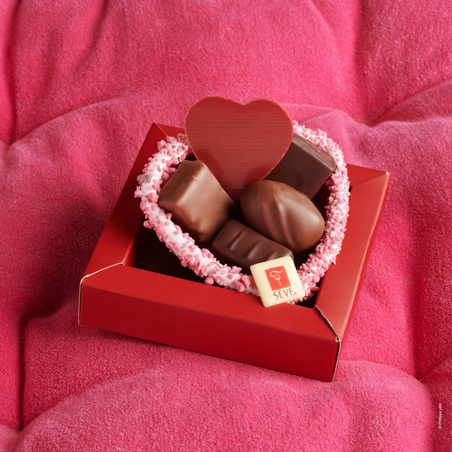 Pour célébrer l’amour avec un grand a, Richard Sève imagine un cœur étincelant constitué d’une crème mousseline a la praline rouge, avec cœur de framboise et fin biscuit moelleux aux amandes. Des pralines rouge maison remplacent le sucre pour adoucir la crème onctueuse tandis que le cœur framboise offre une touche de fraîcheur et d’acidité. Quant a son décor, il a été imaginé comme une jalousie ancienne, les couleurs sont faites à partir de jus de betterave et de radis. Un thé à l’hibiscus ou un champagne rose se mariera à la perfection à cette dégustation avec l’entremets. Cette collection de Saint-Valentins est également assortie avec une bonbonnière en chocolat (noir ou lait). Signature de la Maison Sève, cette bonbonnière est garnie des bonbons de chocolat et est décorée d’une douce guimauve parsemée de pralines rouges. Et pour couronner le tout, pour les éternels amoureux, Sève offre également une création inédite : une bouchée savoureuse de chocolat en forme de cœur fourrée d’une praline maison a la noisette du piémont.