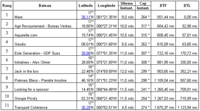 « Une instabilité météo va se renforcer pour la tête de la flotte. Ils quittent les hautes pressions pour rentrer dans un système différent avec plusieurs petites dépressions en montant vers le Yucatan, avec un temps orageux et instable. Dans les prochaines 18h, ils vont rencontrer les mêmes conditions qui seront un peu plus favorable pour les poursuivants. A partir de demain, le caractère orageux sera pour la totalité de la flotte jusqu’à l’arrivée ».