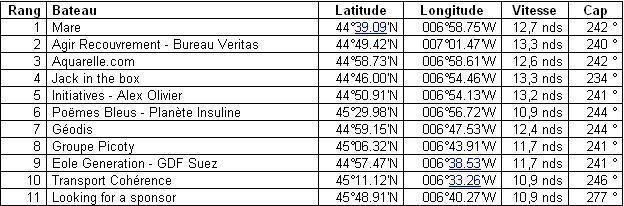 Eric Drouglazet (Aquarelle.com) : « On a hissé le spi dès le départ, il n'y a même pas eu de manœuvres à faire, ça a glissé tranquille toute la nuit. Ce sont vraiment des conditions météo parfaites pour sortir du golfe de Gascogne. C'était un peu frais cette nuit mais là on commence à enlever les polaires. On a 15 nœuds de vent, on marche à 12 nœuds, on devrait être au Cap Finisterre dès demain, on ne peut pas rêver mieux ! »