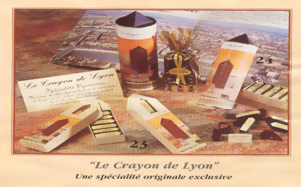 Le crayon de Lyon est fabriqué artisanalement... la forme de ce chocolat ainsi que son emballage ont été inspirés de la tour du crédit lyonnais se situant à la part dieu. Le crayon de Lyon est une spécialité lyonnaises de chocolat à base de chocolat noir et de ganache. En effet le coussin ou le cocon sont composés de pâte d'...