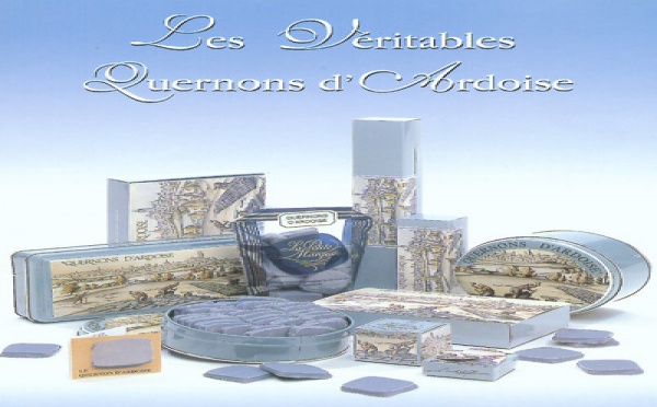 Ce délicieux quernon d’ardoise est composé de nougatine caramélisée, aux amandes et aux noisettes, enrobée d’un chocolat bleu imitant dans sa forme et sa couleur le morceau d’ardoise. Réalisation La Petite Marquise Angers (49)