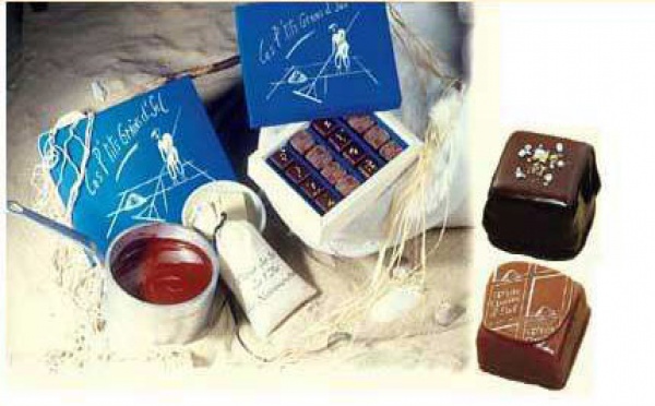 Délices naturels, dont la subtile alliance de la fleur de sel de Noirmoutier, du chocolat noir et du caramel donne naissance à un duo de chocolats au doux parfum du large. Fabrication de la Maison Planchot (85)