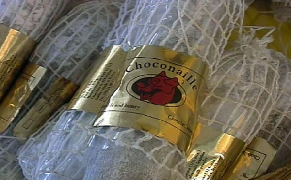 Choconaille, Chocolat noir (70 %) ou chocolat au lait (32 %), miel et amandes, le tout habillé d'un filet à saucisson.
