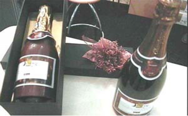Une présentation sympathique des chocolats au marque de champagne dans une bouteille en chocolat (ci-dessous). Ci contre une bouteille en chocolat avec sa garniture et à droite une sélection de champagnes de producteurs de grande qualité.