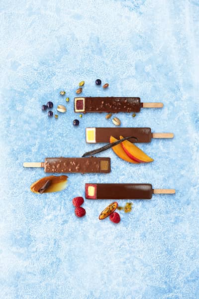 Nicolas Cloiseau, obsédé par le goût et la technique, allie ici son savoir-faire. Il reprend à son compte les barres et bonbons de chocolat glacés de David Wesmael. Dans un enrobage ultra-fin, la coque du chocolat se brise et conserve cette plongée givrée dans une intensité sombre ou lactée. En chocolat, amandes ou noisettes grillées, irrésistiblement croquantes, on attend chaque bouchée avec impatience. En duo complice, sorbets et glaces partagent le frisson du goût", ces bâtonnets ultra-fins laissent le chocolat fondu à chaque bouchée. A force de croquer des sorbets pleins de fruits, on cède aux glaces onctueuses.