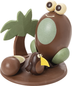 Quant au Toucan noir, il est connu pour sa silhouette et son grand bec coloré. Alban se déguste avec gourmandise grâce à sa trilogie de chocolat. Une charmante compagnie vient également parfaire la décoration de la table de Pâques. Claudette la Poulette et sa copine l’accompagnent pour former ce trio original et coloré. Pour varier les plaisirs, sachez que sur son île exotique, Gribouille la Grenouille se prélasse à l’ombre d’un palmier et déguste une noix de coco en chocolat !