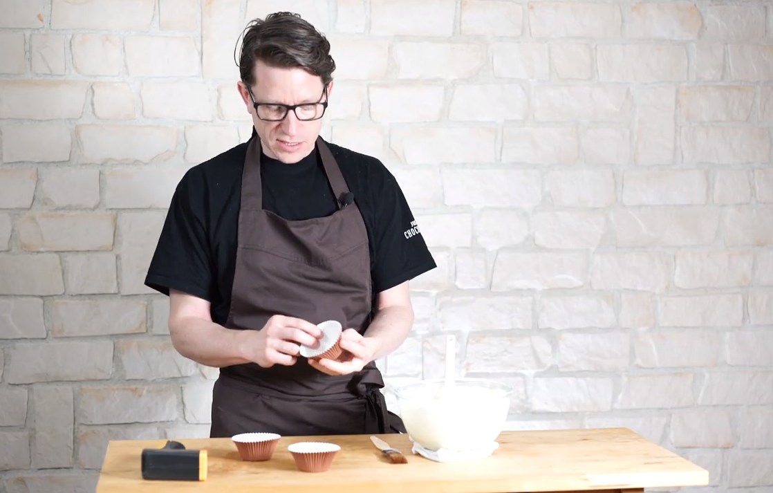 Nous allons prendre des cassettes, comme un moule. Des cassettes, c’est ce que vous utilisez pour des gâteaux ou pour les cupcakes, les muffins, vous mettez votre pâte et vous mettez dans le four. Vous allez prendre un pinceau. La méthode pinceau, pourquoi ? Parce que vous avez plein de rainures et si vous faites juste couler, il peut y avoir des bulles d’airs, etc. Donc, j’utilise cette méthode-là, vraiment dans le sens des rainures. Cela vous permet d’avoir quelque chose avec une empreinte plus forte quand vous allez démouler. Je refais tout autour pour que cela soit bien imprégné. Je remets un petit peu dans le fond. Cela va être un socle, parce que je vais le laisser dans le fond. Toujours mélanger pour ne pas que la température puisse baisser, pour qu’elle soit homogène au niveau du chocolat. Vraiment, allez dans les rainures. On va mettre un petit peu de chocolat au fond. Vous pouvez le laisser comme cela. Le chocolat, du bord, il va descendre. Vraiment, allez dans les rainures. Je vais remettre un petit peu au fond. Cela va être prix. Ensuite, je vais refaire une toute petite couche, très fine, sur les bords. On pourrait mettre une seule couche, mais cela risquerait d’être un peu juste en terme d’épaisseur.