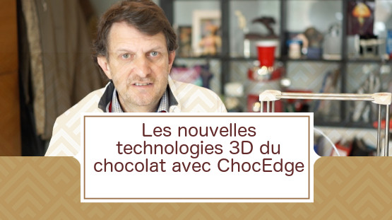 Depuis 2003 l’agence s’intéresse à l’impression 3D alimentaire ; donc on a été approché par la firme anglaise Choc Edge qui a, la première, fait une imprimante 3D et a choisi la matière alimentaire le chocolat. Donc ça s’appelle la Choc Creator. Elle a un chauffage intégré qui reçoit la cartouche pour maintenir le chocolat à température. On l’a mise à 32°C. On a pris un chocolat d’enrobage, 55% de chocolat. Donc on va faire le logo de la Confédération des Chocolatiers et Confiseurs. Je vais remplir ma cartouche que voici, qui est en inox. Donc moi j’utilise cette technique plutôt que l’aspiration pour éviter, forcément, les bulles, et je peux faire avec cette contenance pas mal de décors qui vont être imprimés entre cinq et dix minutes jusqu’à vingt minutes pour les plus grands décors. Voilà. Et je mets un embout. Le petit trou. Là on le voit sortir. Voilà, ce sont des toute petites buses en inox qui sont aussi facilement nettoyables. Donc là on met la seringue dans l’emplacement. On ferme le capot. Et c’est parti pour cinq minutes d’impression 3D.