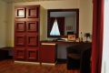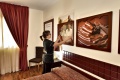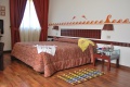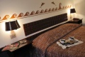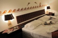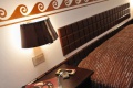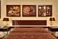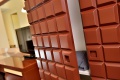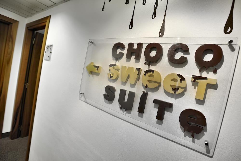 Aussi surprenant que cela puisse paraître, l’ensemble de la décoration, jusqu’aux plus petits détails, fait référence au chocolat : les portes de placards, les têtes de lit, les couvre-lits, les abat-jours de lampes, les frises murales et même les porte-clefs de chambres qui ne sont ni plus ni moins que des carrés de chocolat.